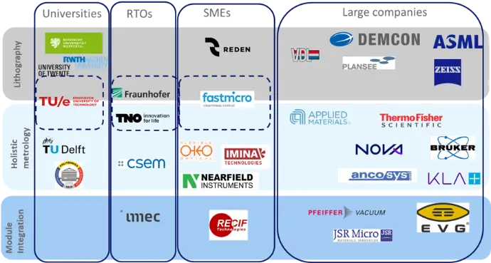 Each work package, lithography, Holistic Metrology and Module Integration constains partners from each organization type.